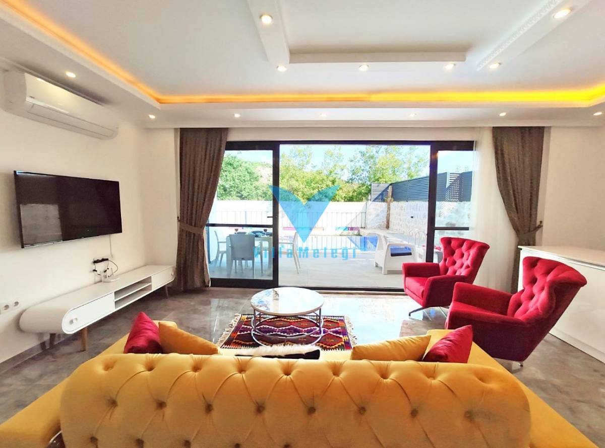 Salon : Salon bölümünde şık bir oturma grubu, berjer, orta sehpa, TV, klima, yemek masası ve havuz terasına direkt çıkış bulunur.