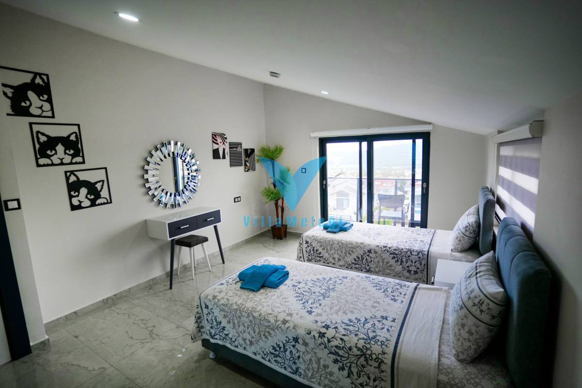 Toplamda 4 yatak odası bulunan villamızın 4 adet banyosu ve 2 adet ayrıca WC mevcuttur. Tüm yatak odalarında bulunan ebeveyn banyosu sayesinde misafirlerimiz rahatlıkla konaklayabileceklerdir. Villamızda zemin katında katında Türk hamamı, sauna, ısıtmalı iç havuz ve WC yer almaktadır. 1.katta ise açık mutfak-salon, TV, klima ve WC yer alırken, 2. katta birinci ve ikinci yatak odası yer alır. Birinci ve ikinci yatak odalarında birer adet çift kişilik yatak, klima, TV, WC-Duş ve jakuzi bulunmaktadır. Çatı katında yer alan üçüncü ve dördüncü yatak odalarında ise ikişer adet tek kişilik yatak, klima ve WC-Duş yer almaktadır.