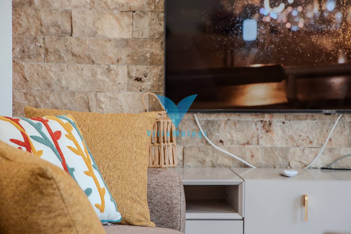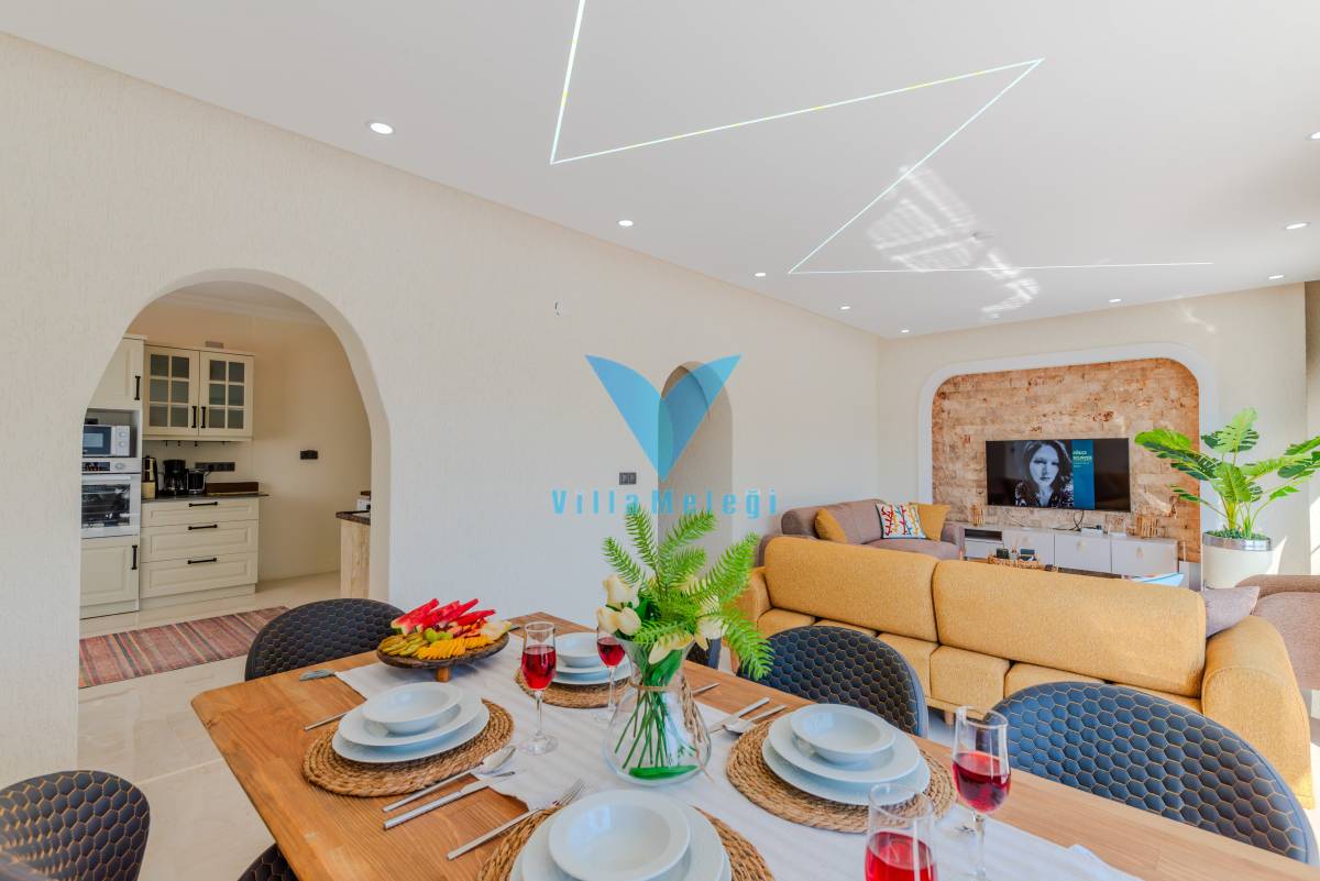 Doğa manzaralı salonunda; lüks oturma grubu, uydu alıcı, televizyon, klima, orta sehpa, yemek masası, internet ve havuza çıkış bulunmaktadır.