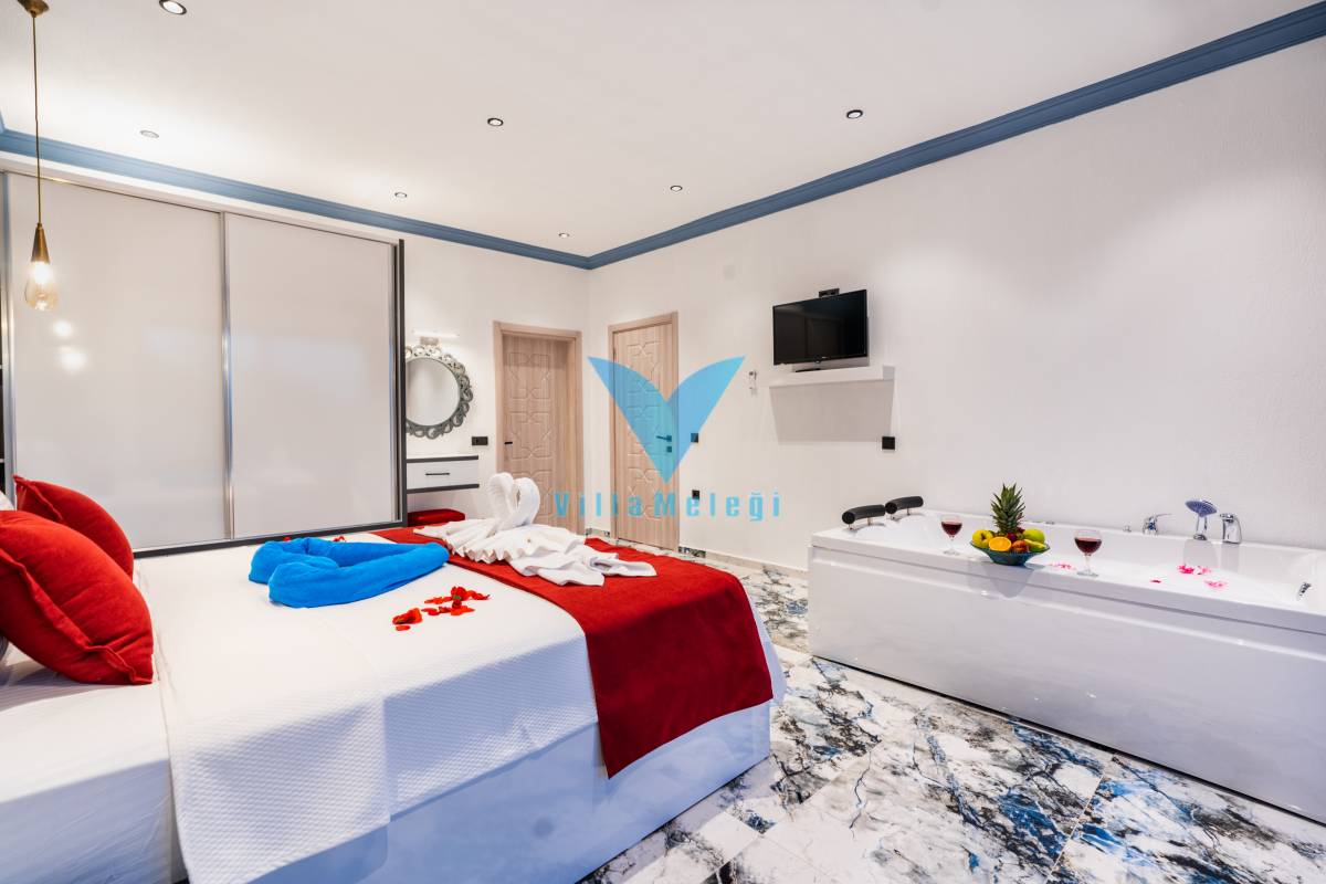 1.Yatak Odası: 1 çift kişilik yatak, televizyon, klima, komodin, makyaj aynası, jakuzi, banyo ve tuvalet bulunmaktadır.