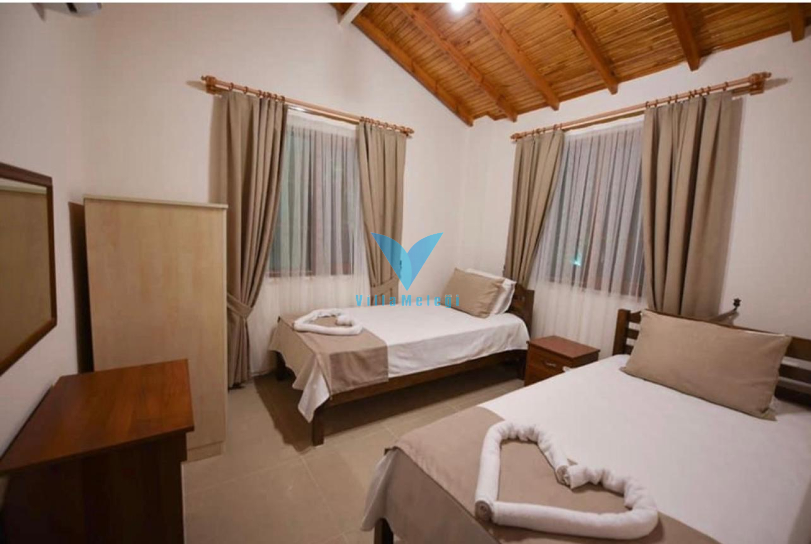 İki adet tek kişilik yatak, elbise dolabı, komodin ve klima mevcuttur.