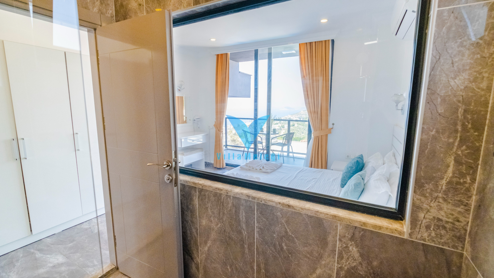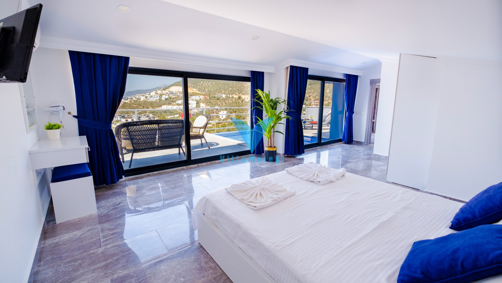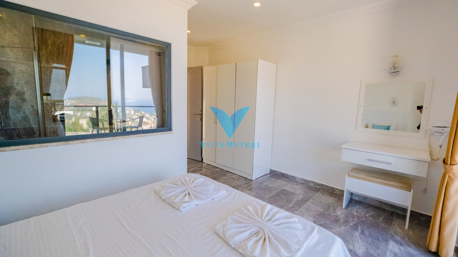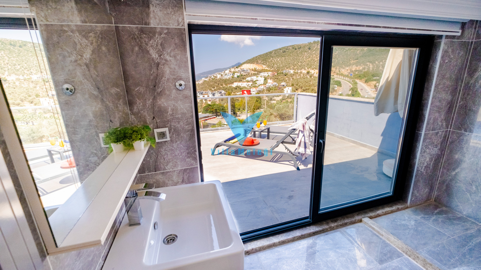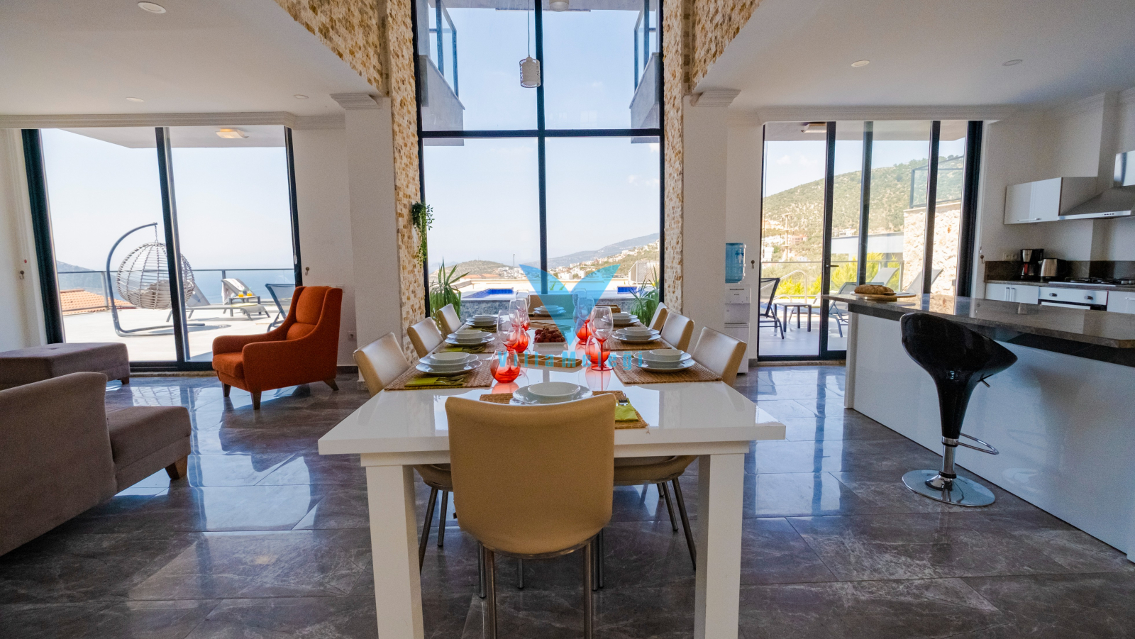 Villa VM 2808, Kalkan'ın Kızıltaş bölgesinde etkileyici bir mülktür. Villada, biri zemin katta ve dördü üst katlarda olmak üzere 5 adet ebeveyn banyolu yatak odası bulunmaktadır. Mermer ve demirden yapılmış zarif bir spiral merdiven, üst katları zemin kata bağlar. Villanın öne çıkan özelliklerinden biri, çatı terasına açılan, bir dalma havuzu içeren ve muhteşem manzaralar sunan en üst kattaki ana yatak odasıdır. Villanın iç mekanı, aydınlık ve ferah hissettiren açık planlı bir tasarıma sahiptir. Zemin kattaki oturma odası ve mutfak, havuz terasının manzarasını güzel bir şekilde vurgulayan yüksek bir çift pencereden gelen doğal ışıkla doludur. Geniş sürgülü kapılar, sonsuzluk havuzu bulunan cömert bir havuz terasına açılır. Bu teras, dağların ve denizin muhteşem manzaralarını seyrederken barbekü yapmak için mükemmeldir ve yemek yemek, güneşlenmek veya salıncak sandalyesinde dinlenmek için bolca alan sunar.