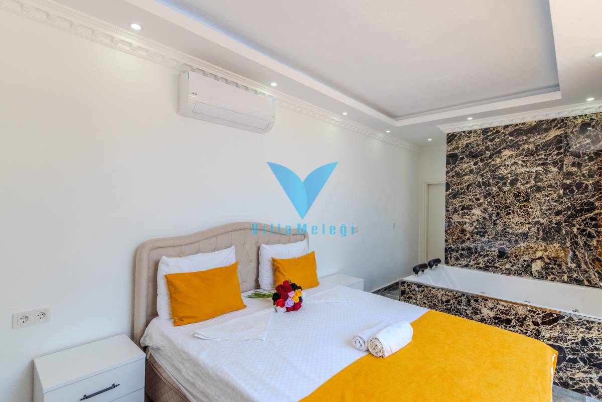 1. Yatak Odası; 1 adet çift kişilik yatak, klima, komodin, elbise dolabı, makyaj masası, jakuzi, balkon, banyo ve tuvalet bulunmaktadır.
