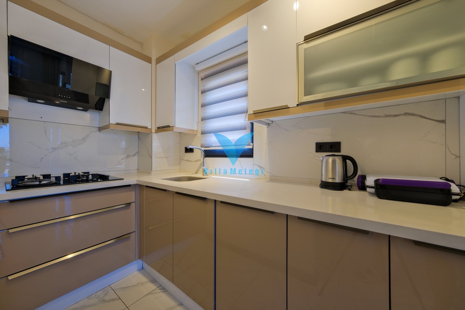 Mutfak : Modern Amerikan mutfakta buzdolabı, bulaşık makinası,fırın,4'lü ocak, mikrodalga fırın, kettle, 8 kişilik yemek masası, yemek takımları, çatal ve bıçak takımları, tencere ve tava takımları, bardaklar bulunmaktadır