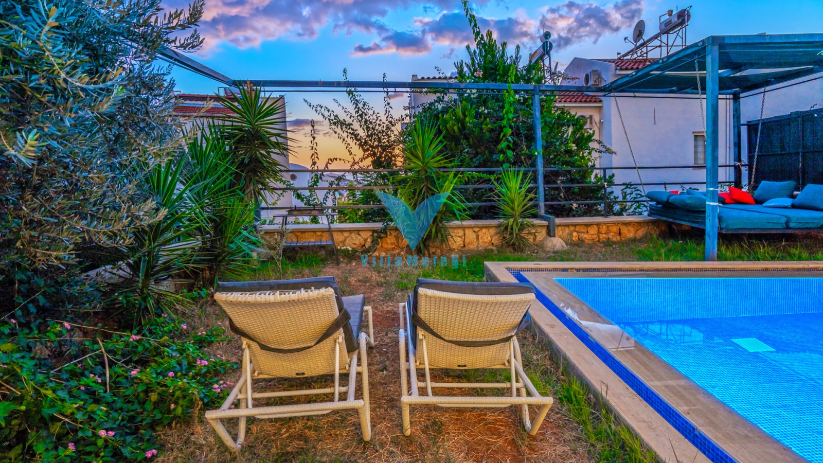 Salon : Oturma odamız oturma grubu, klima, LCD TV, sehpa ve uydu alıcı ile donatılmıştır. Villamızın birinci katındadır. Salona açılan terasta 2 kişilik oturma grubu vardır.