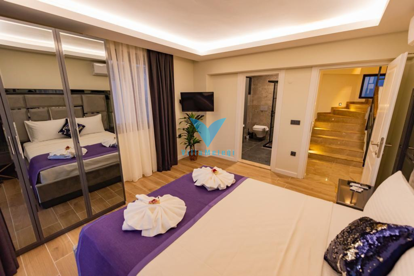 Villamızın içerisinde 4 adet yatak odası ve 3 adet WC-Duş bulunmaktadır. Birinci ve ikinci yatak odaları içerisinde birer adet çift kişilik yatak, klima, TV ve banyo yer almaktadır. Üçüncü yatak odası içerisinde bir adet çift kişilik yatak, jakuzi, TV ve klima bulunmaktadır. Dördüncü yatak odasında ise iki adet tek kişilik yatak, klima ve TV bulunmaktadır. Ortak alanda ise salon-mutfak, klima, televizyon, WC bulunmaktadır. Aynı zamanda çatı katında da ortak kullanıma uygun WC- Duş yer almaktadır.
