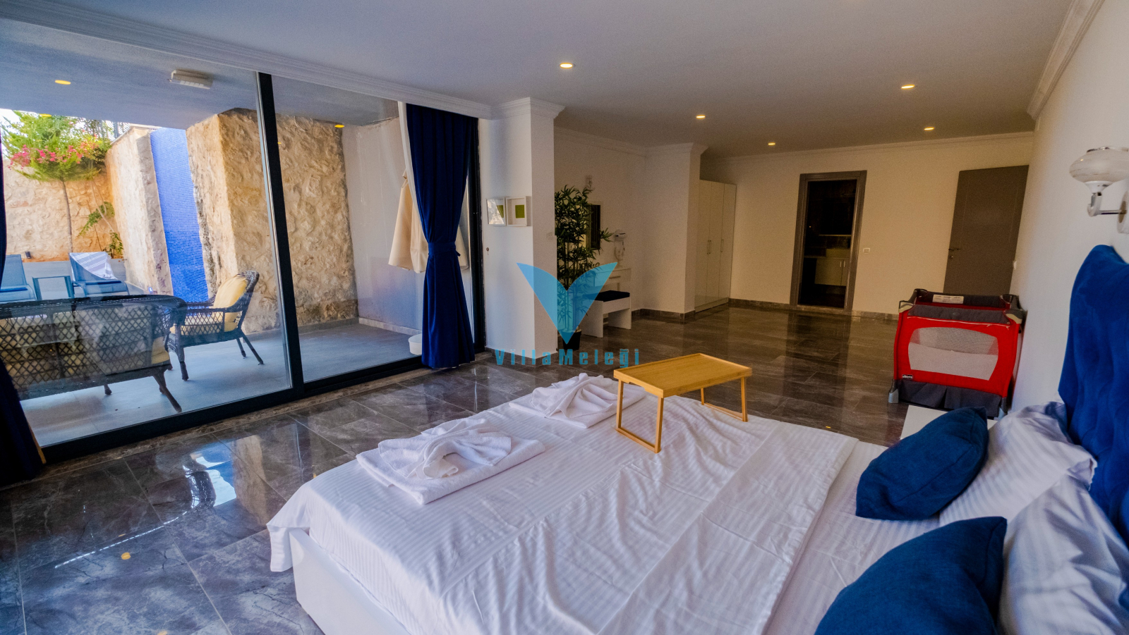 5. Yatak Odası : Suit Aile Yatak Odası, Havuzlu (Bodrum katta) Çift kişilik yatak, Komidin, Makyaj masası, Klima, Elbise dolabı, Banyo ve Bahçeye ve 2. havuz başına çıkış bulunmaktadır.