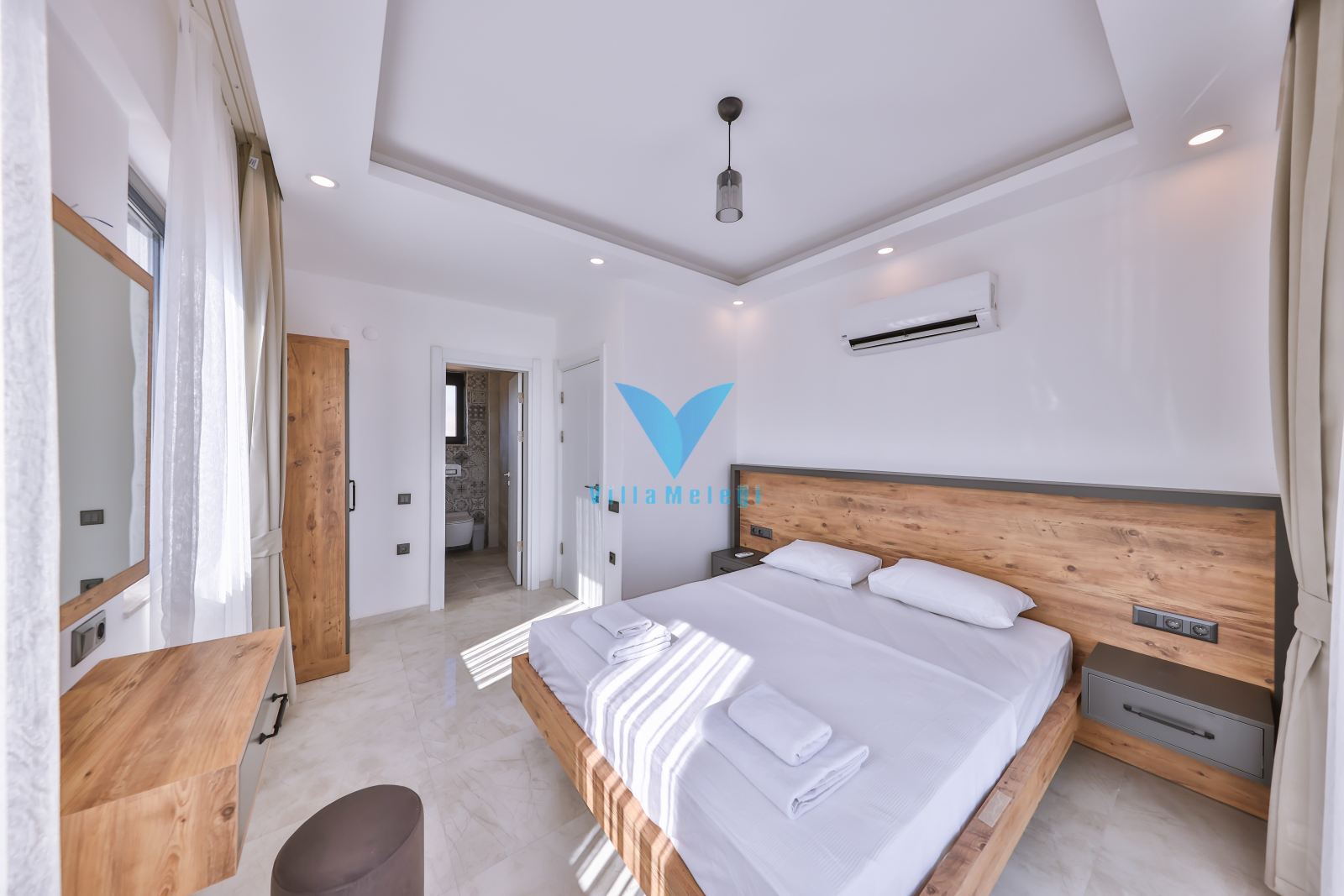 1. Yatak Odası : Doğa ile iç içe olan villamızın yatak odası manzarasında da sizi sonsuz güzel yeşillikler karşılayacak. Beraberinde çift kişilik yatak, klima, komodin, banyo ve lavabo bulunmaktadır.