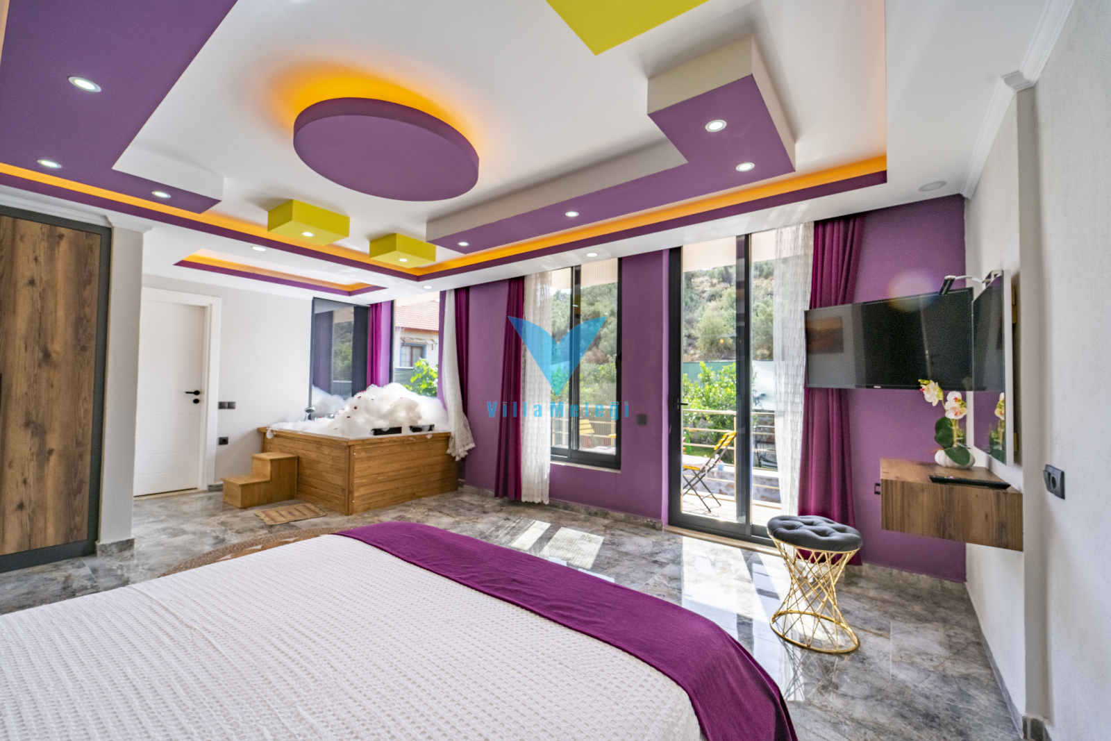 2. Yatak Odası: 1 adet çift kişilik yatak, televizyon, klima, jakuzi, komodin, aynalı makyaj masası, elbise dolabı, banyo ve tuvalet bulunmaktadır.