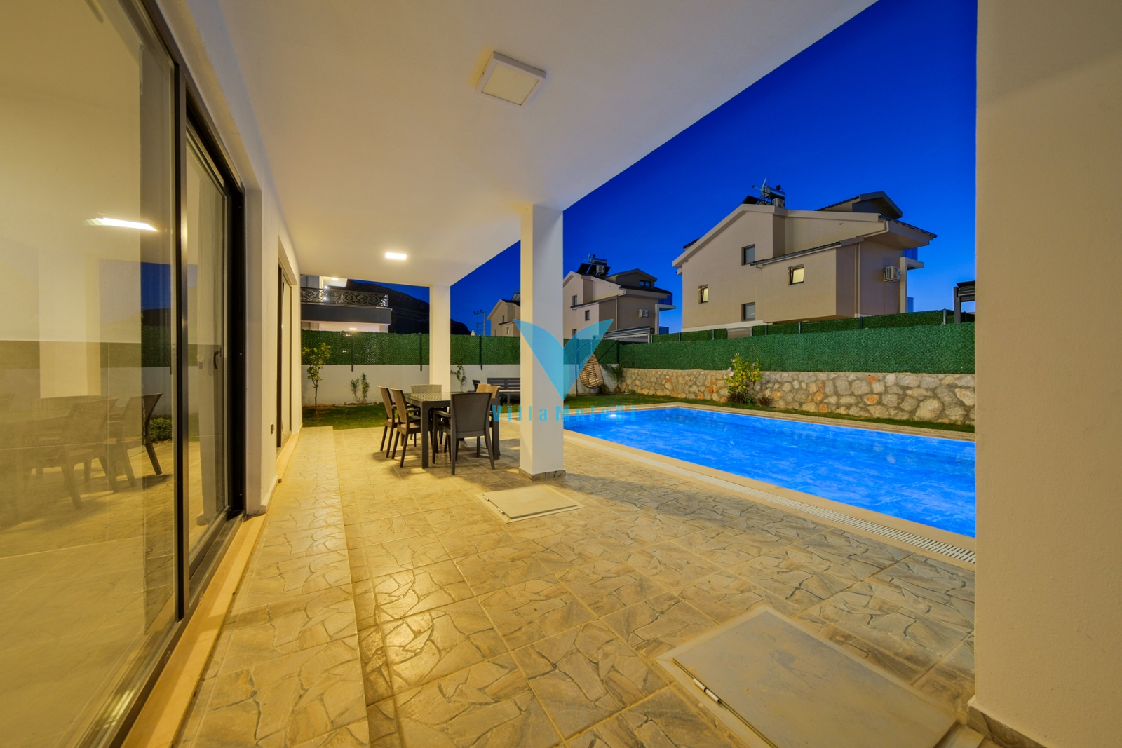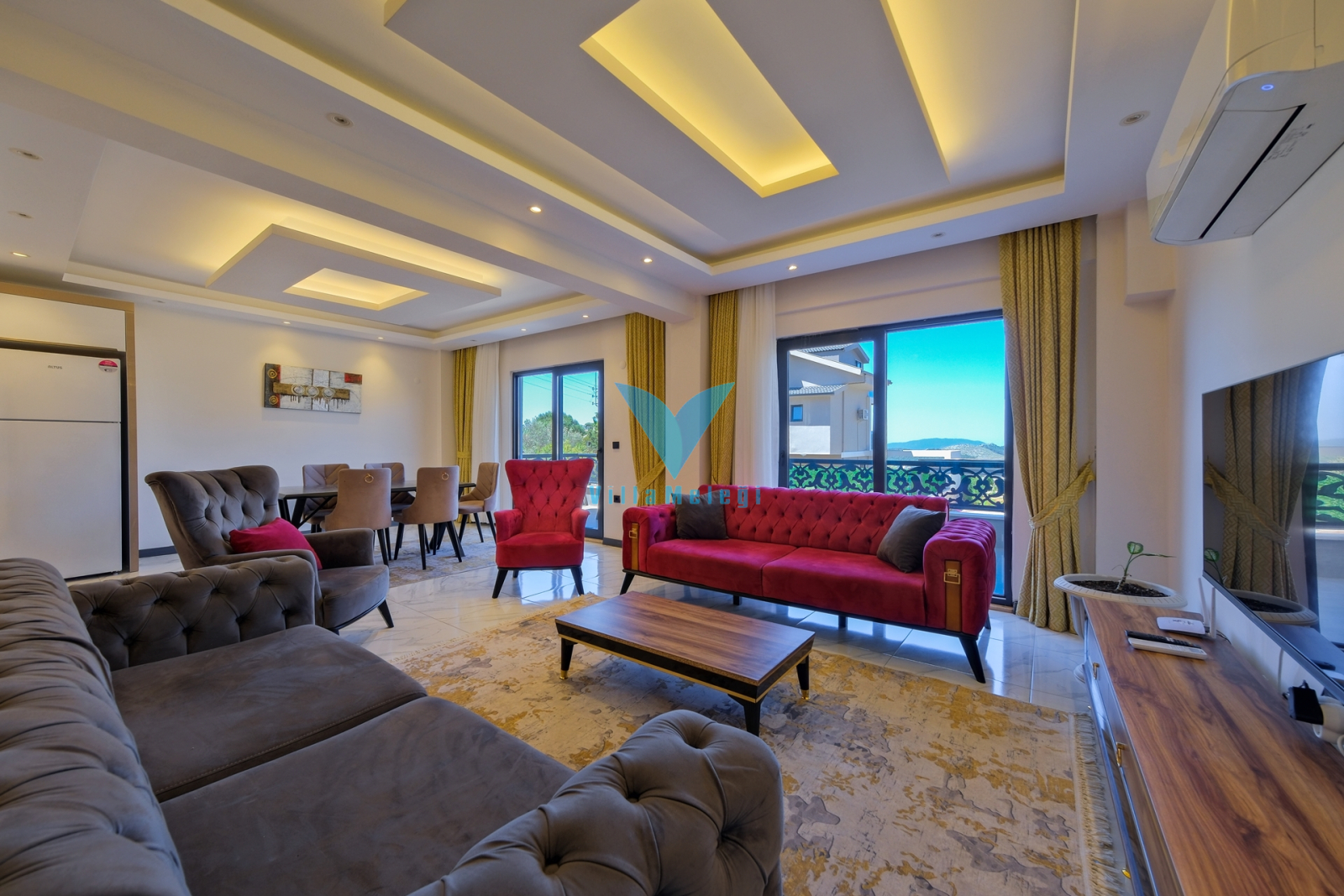 Salon : Salonumuzda oturma grubu, klima, LCD TV, sehpa, uydu alıcı bulunmaktadır. Havuz terasına çıkış yapılabilmektedir.